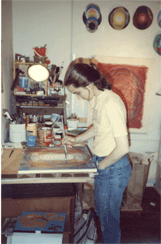 Working and childrearing and emerging health problems took time and energy away from her art, but she continued to forge ahead, appearing in a group show of Vermont Visual Artists at the Vermont State House in Montpelier in the winter of 1988, in a show called “Sacred Art” at the Springfield (VT) Art and Historical Society in the summer of 1989, in “New England Women: Valley Women Artists,” a juried exhibition at the Northampton (MA) Center for the Arts in 1990, and in a group show, “View From the Edge,” at the Fletcher Library in Burlington, VT, in Spring 1991. She had a solo exhibition at Community College of Vermont (Middlebury), a two-person show at the South County Cenmter for the Arts in West Kingston, RI, in May 1992, a two-artist exhibition at the Geonomics Institute at Middlebury College in winter 1993, a group show, "No More Nice Girls," at the ABC No Rio Gallery in New York City, in early 1994. Work traveled with the DNA Xerox Project, an exhibition of works related to AIDS and curated by Spiral Arts, between 1994-1998.